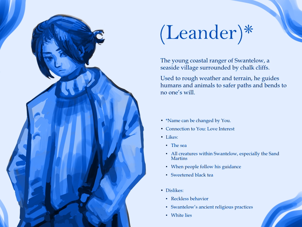 After years of hard work, you've saved up enough money to move to Swantelow, a quaint village by the sea. There, working as the ranger's assistant, you hoped for peace, freedom and a little romance.